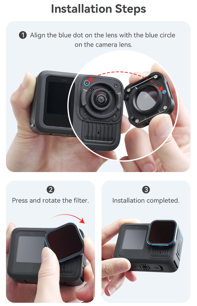 Typ produktu: ND filtr pro akční kameru Materiál skla: optické sklo Materiál rámu: hliníková slitina Konstrukce: vodotěsná s integrovaným těsněním Instalace: nasazovací systém na objektiv Určení: natáčení videa a fotografování v jasném prostředí
