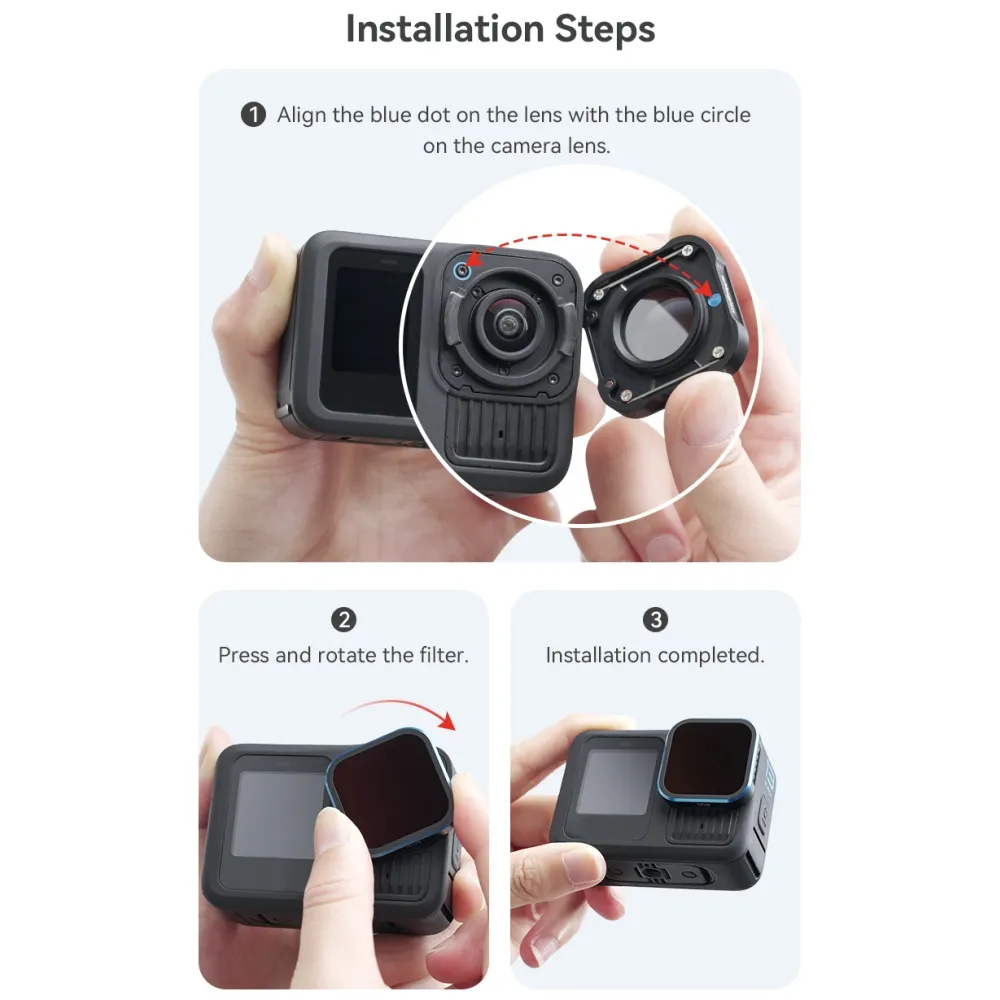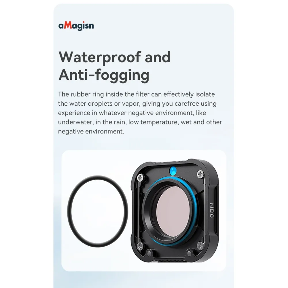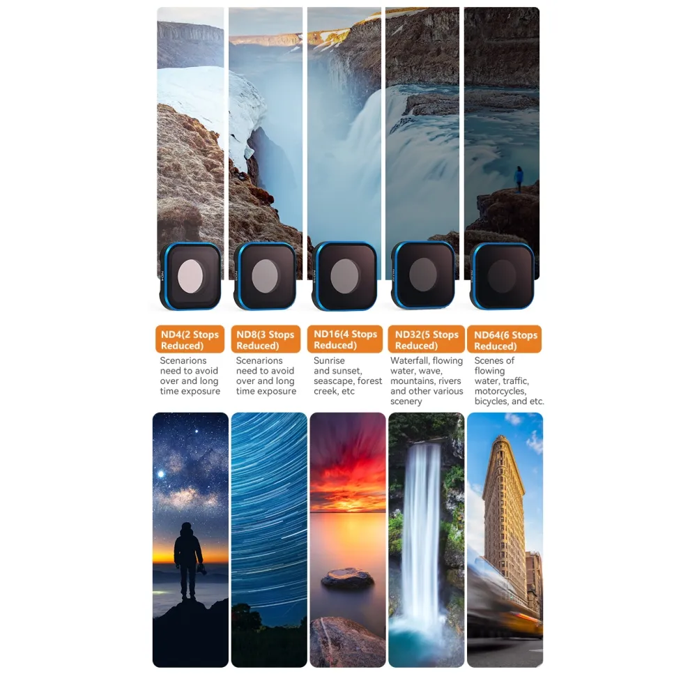 AMAGISN vodotěsná sada ND filtrů pro GoPro Hero 13 12 11 11 Mini 10 9 ND4 ND8 ND16 ND32 je profesionální příslušenství určené pro natáčení v jasných a náročných světelných podmínkách. Filtry jsou přesně navrženy pro kompatibilní modely kamer a zachovávají jejich plnou funkčnost i voděodolnost. Díky kvalitnímu optickému sklu zůstává obraz ostrý, barevně vyvážený a bez nežádoucích přepalů.