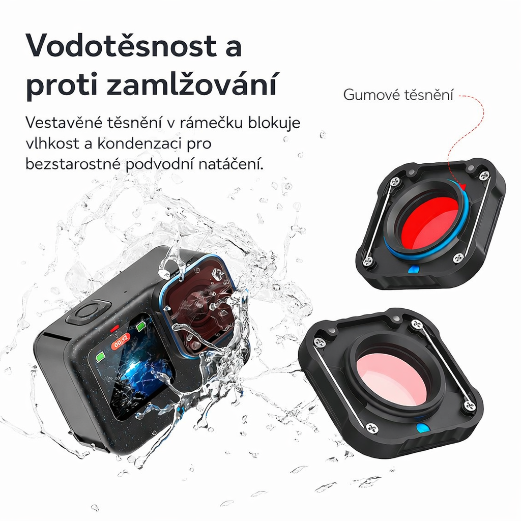 AMAGISN potápěčský filtr na objektiv pro GoPro Hero 13/12/11/11 Mini/10/9 červený je navržen pro natáčení pod vodou, kde pomáhá vyvážit ztrátu červeného spektra a zlepšuje barevné podání záznamu. Světle červený filtr optimalizuje obraz při potápění v moři i sladké vodě a přispívá k přirozenějším barvám bez nutnosti výrazných úprav v postprodukci. Precizní konstrukce zajišťuje přesné usazení na objektivu kamery a stabilní držení i při pohybu ve vodě.
