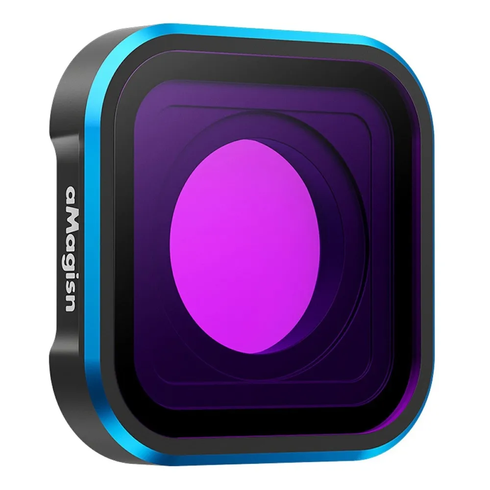 AMAGISN potápěčský filtr na objektiv pro GoPro Hero 13/12/11/11 Mini/10/9 fialový je navržen pro natáčení pod vodou, kde pomáhá vyvážit ztrátu červeného spektra a zlepšuje barevné podání záznamu. Světle červený filtr optimalizuje obraz při potápění v moři i sladké vodě a přispívá k přirozenějším barvám bez nutnosti výrazných úprav v postprodukci. Precizní konstrukce zajišťuje přesné usazení na objektivu kamery a stabilní držení i při pohybu ve vodě.