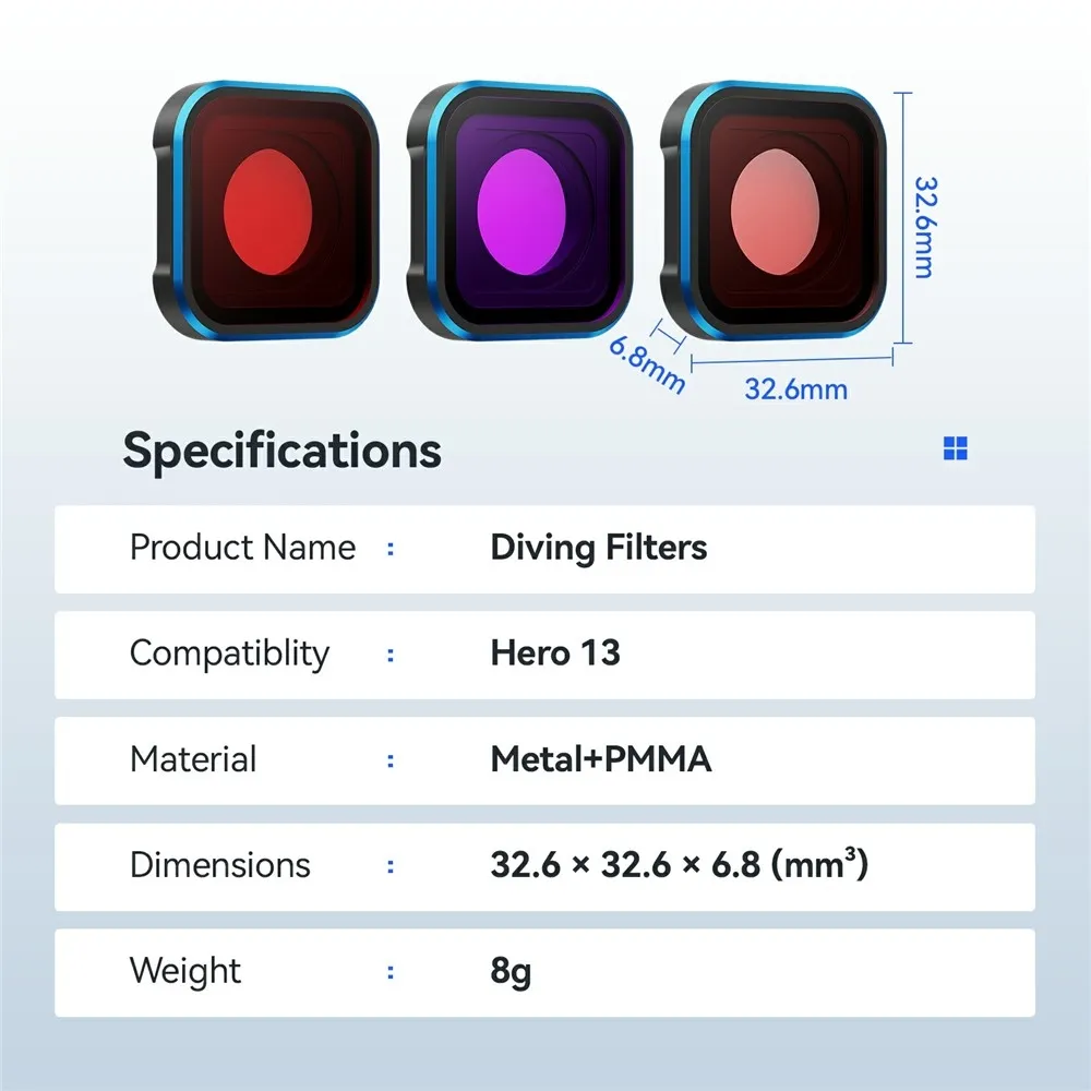 Filtr je určen pro použití s akčními kamerami GoPro Hero 13, 12, 11, 11 Mini, 10 a 9 a je ideálním doplňkem pro zlepšení kvality podvodních záběrů při rekreačním i sportovním potápění.