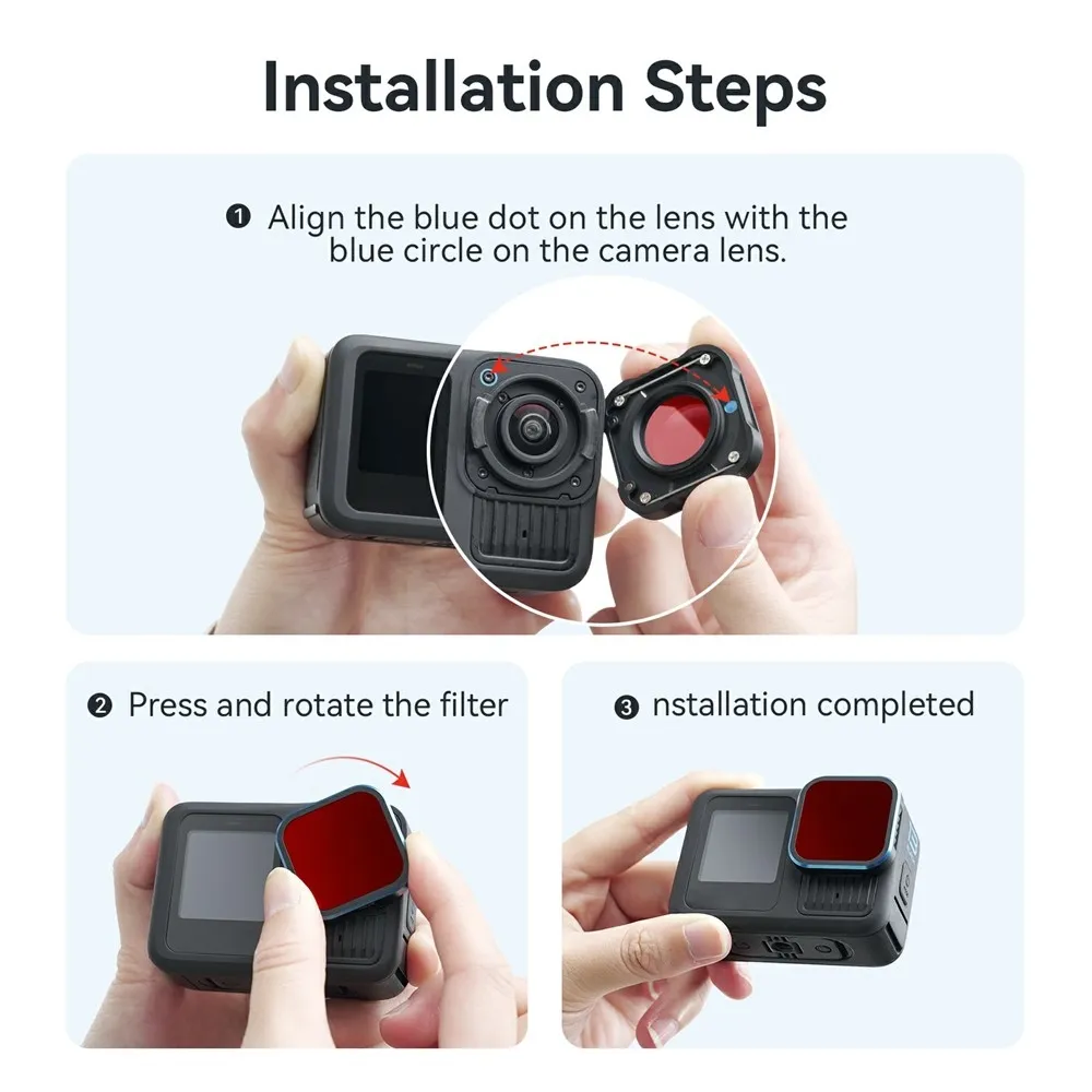 Filtr je vyroben z kombinace kovu a akrylu, což zaručuje nízkou hmotnost a zároveň vysokou odolnost. Integrovaný gumový těsnicí kroužek pomáhá zajistit vodotěsnost a omezuje vznik zamlžení při změnách teploty. Díky kompaktním rozměrům nijak výrazně nezvyšuje velikost kamery a umožňuje pohodlné použití při potápění, šnorchlování i dalších vodních aktivitách.