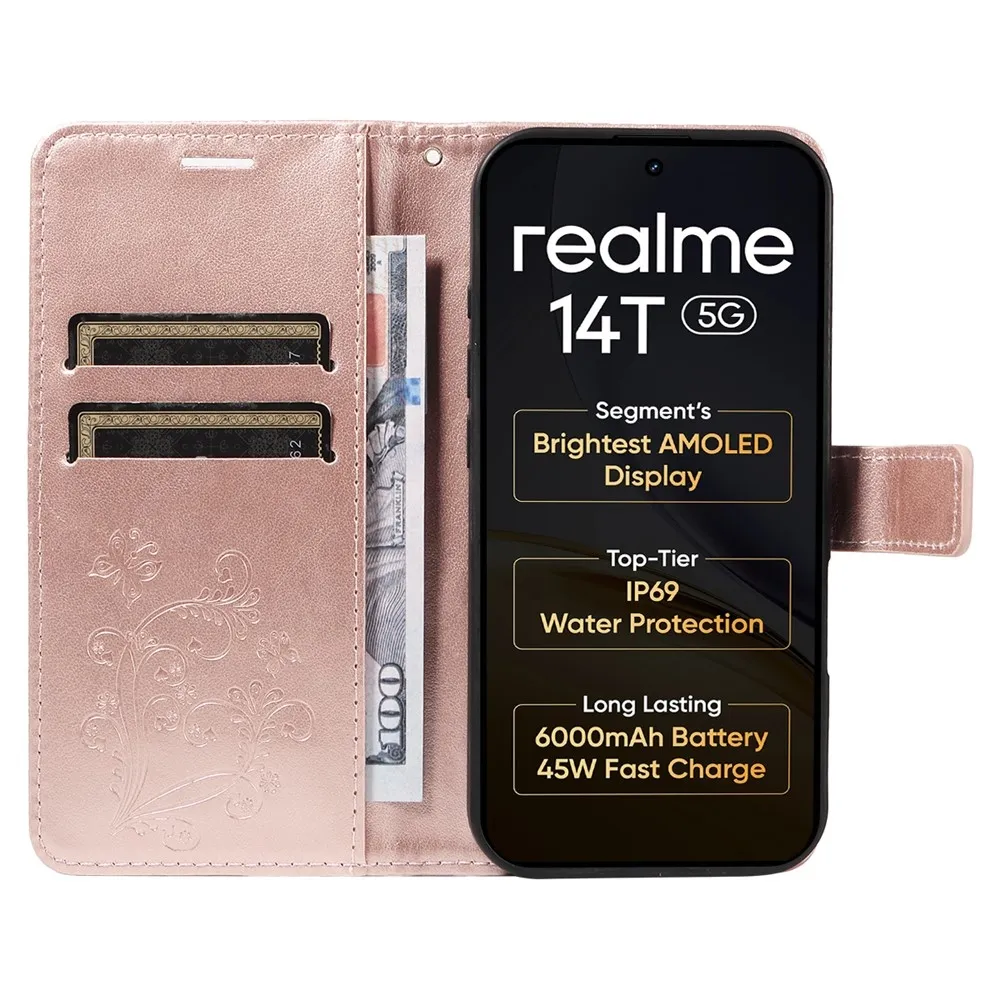 Růžovozlaté peněženkové pouzdro Big Butterfly na mobil Realme 14 5G/14T 5G