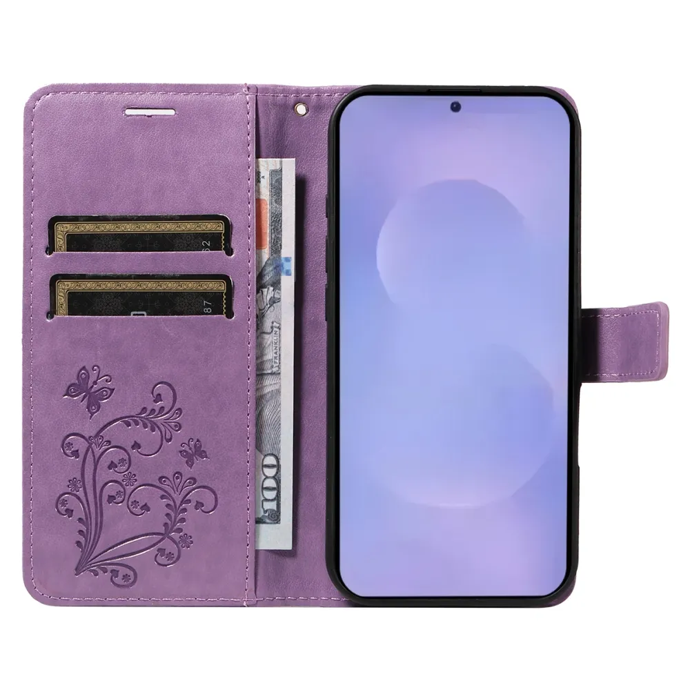 Fialové peněženkové pouzdro Big Butterfly na mobil Samsung Galaxy S26+