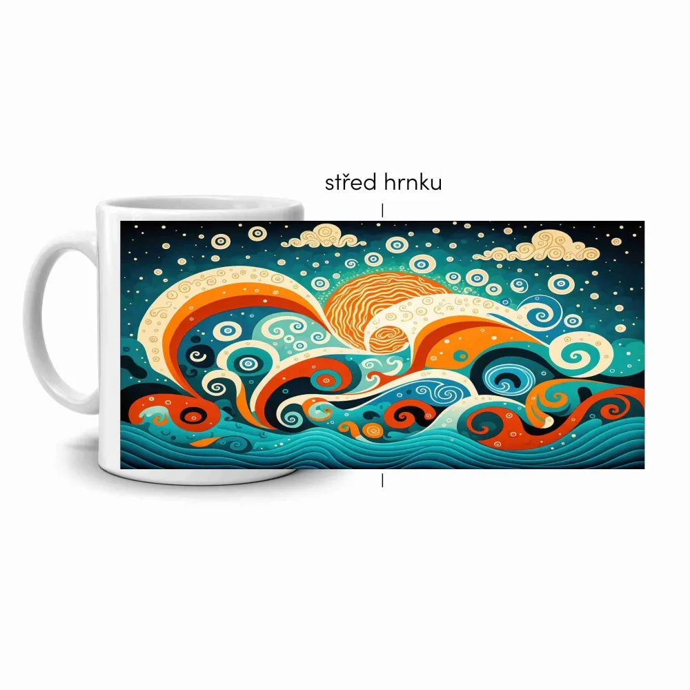 Hravá kombinace teplých a chladných tónů vytváří dojem pohybu a harmonie mezi mořem a oblohou. Tento abstraktní motiv připomíná tanec vln a slunečních paprsků, které se prolínají do jedné pulzující kompozice. Hrnek působí energicky, optimisticky a přináší do každého dne kousek radosti a tvořivosti. Hrnek je vhodný do myčky!