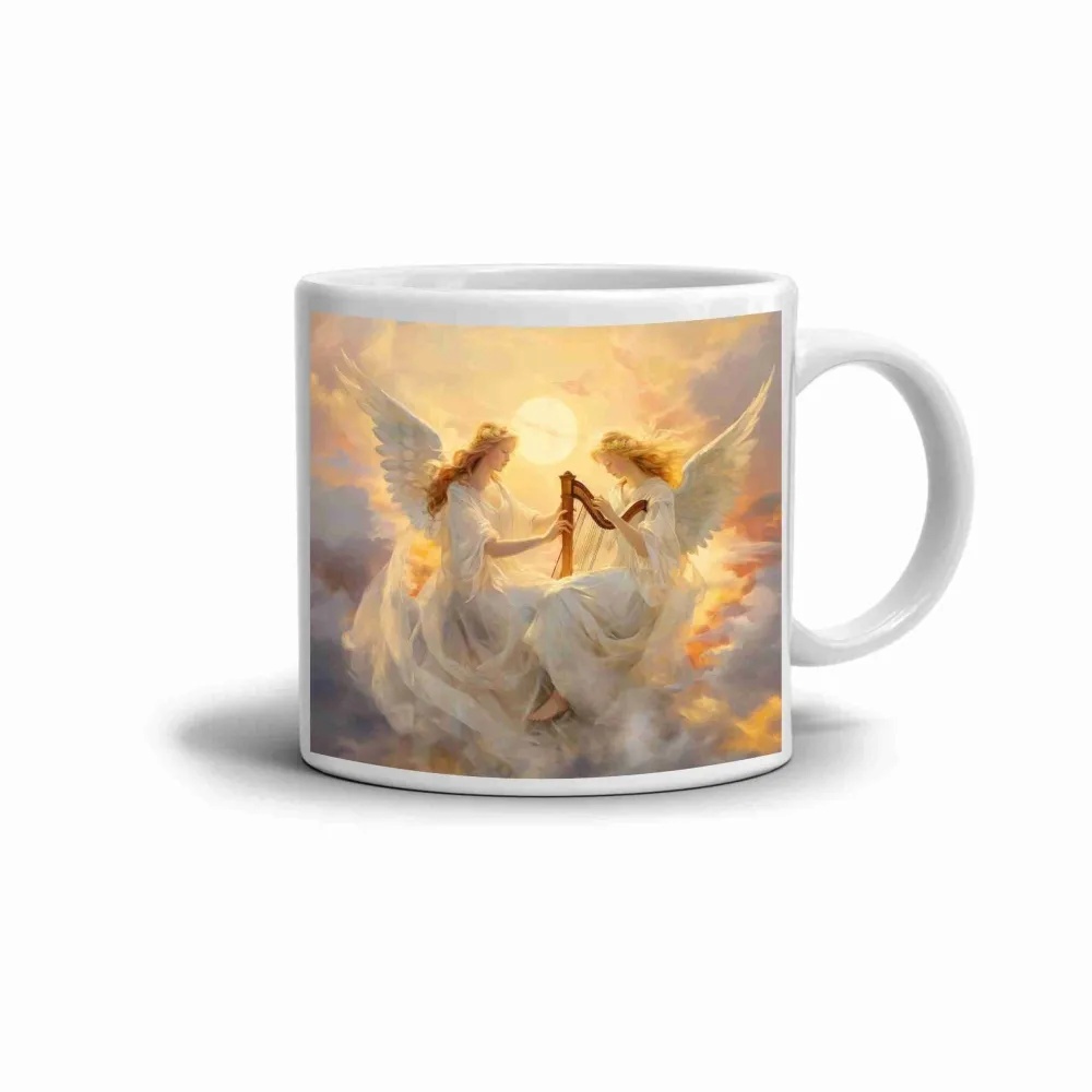 Něžný motiv dvou andělů hrajících na harfu vytváří pocit klidu, harmonie a světelné energie. Jemné zlaté a broskvové tóny spolu s obláčky vyzařují teplo a duchovní pohodu, zatímco křídla andělů dodávají motivu lehkost a eleganci. Tento motiv přináší do každodenního pití nápojů pocit něhy a inspirace. Ideální pro všechny, kteří hledají krásu a jemnou harmonii ve svém dni. Hrnek je vhodný do myčky!