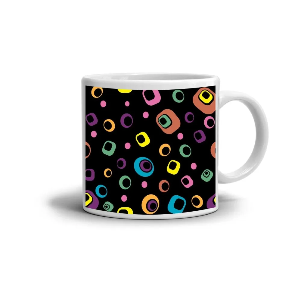 Na hrnku se objevuje výrazný Abstraktní motiv, který zaujme hrou barev a tvarů. Barevné kruhy a čtverce rozeseté po černém pozadí vytvářejí dojem pohybu a radostné energie. Tento vzor působí moderně, originálně a dodává každému okamžiku s kávou či čajem kreativní nádech. Hrnek je vhodný do myčky!