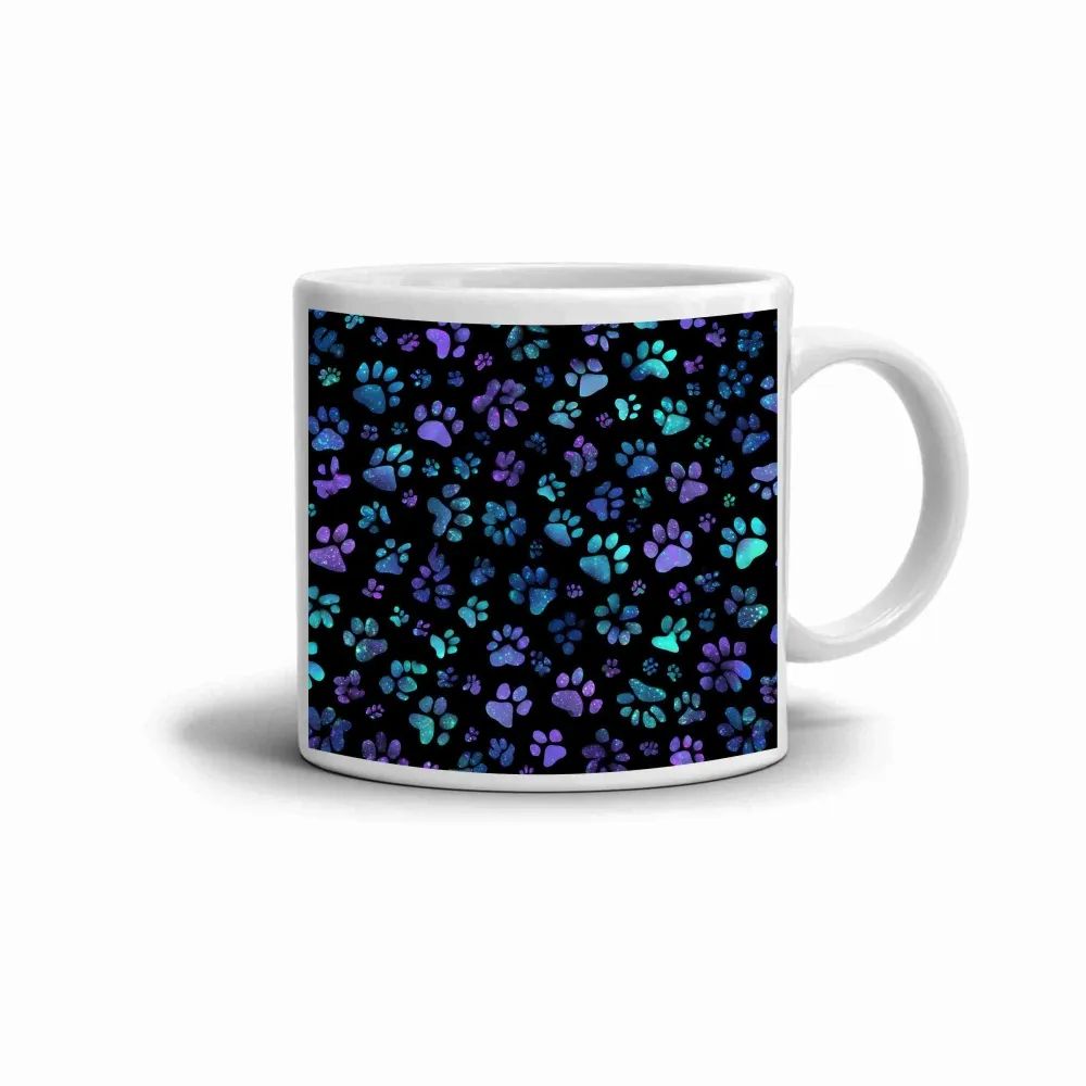 Na tmavém podkladu se rozprostírá vzor barevných tlapiček, který působí hravě a moderně. Kombinace odstínů modré, fialové a tyrkysové vytváří dojem pohybu a radosti. Tento abstraktní motiv je ideální pro milovníky zvířat i pro ty, kteří mají rádi originální design s jemným nádechem veselosti. Hrnek je vhodný do myčky!