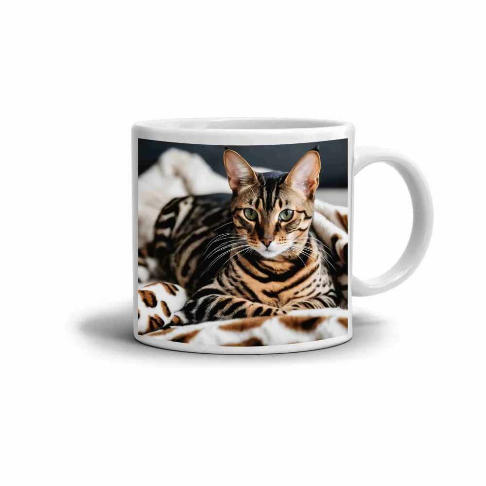 Na hrnku se objevuje působivý portrét bengálské kočky, jejíž typická kresba srsti s výraznými skvrnami a pruhy tvoří nádherný a výrazný motiv. Teplé odstíny, elegantní držení těla a pozorný pohled dodávají obrázku výjimečný charakter, díky němuž působí celý motiv živě, noblesně a velmi přirozeně. Hrnek je vhodný do myčky!
