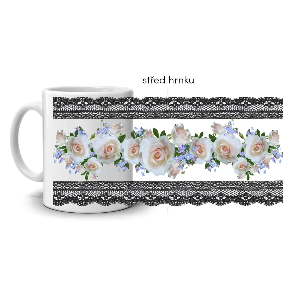 Motiv s bílými růžemi a modrými kvítky působí jemně a čistě. Kombinace světlých tónů s elegantní černou krajkou vytváří vyvážený kontrast, který dodává hrnku noblesu a lehkost. Tento motiv přináší pocit klidu, elegance a harmonie. Hrnek je vhodný do myčky!