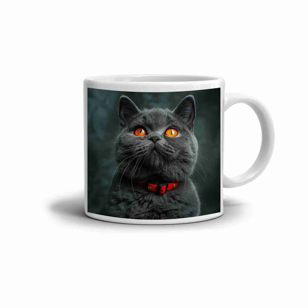 Na tomto hrnku vyniká působivý motiv britské krátkosrsté kočky, která okouzlí svým hustým šedým kožíškem a výraznýma jantarovýma očima. Tiché soustředění v její tváři dodává motivu jemnou majestátnost a hrnek působí jako elegantní doplněk, který potěší každého milovníka tohoto oblíbeného plemene. Hrnek je vhodný do myčky!