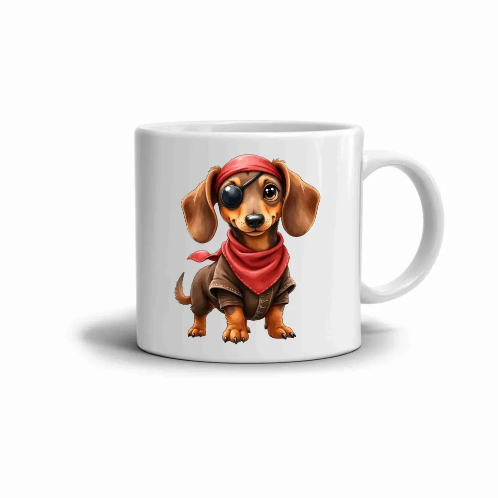 Motiv hrnku přináší vtipnou a roztomilou kombinaci. Jezevčík oblečený jako pirát s páskou přes oko a červeným šátkem působí zábavně a dobrodružně, což dodává hrnku hravý charakter. Barevné detaily oživují celý vzhled a přinášejí do každého dne radost i špetku fantazie. Hrnek je vhodný do myčky!