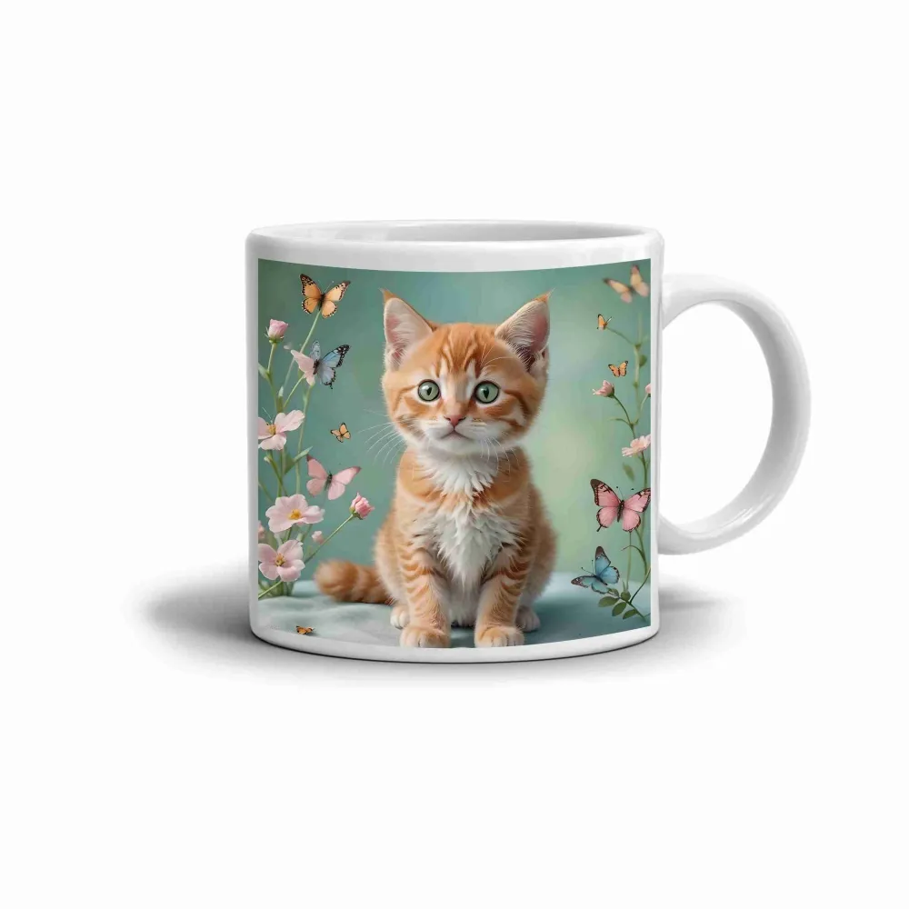 Motiv s roztomilým koťátkem obklopeným motýly a květinami vyvolává pocit klidu, radosti a něžnosti. Jemné barvy a hravé detaily působí harmonicky a přinášejí úsměv při každém pohledu. Tento keramický hrnek je ideální pro milovníky zvířat a romantických motivů. Hrnek je vhodný do myčky!