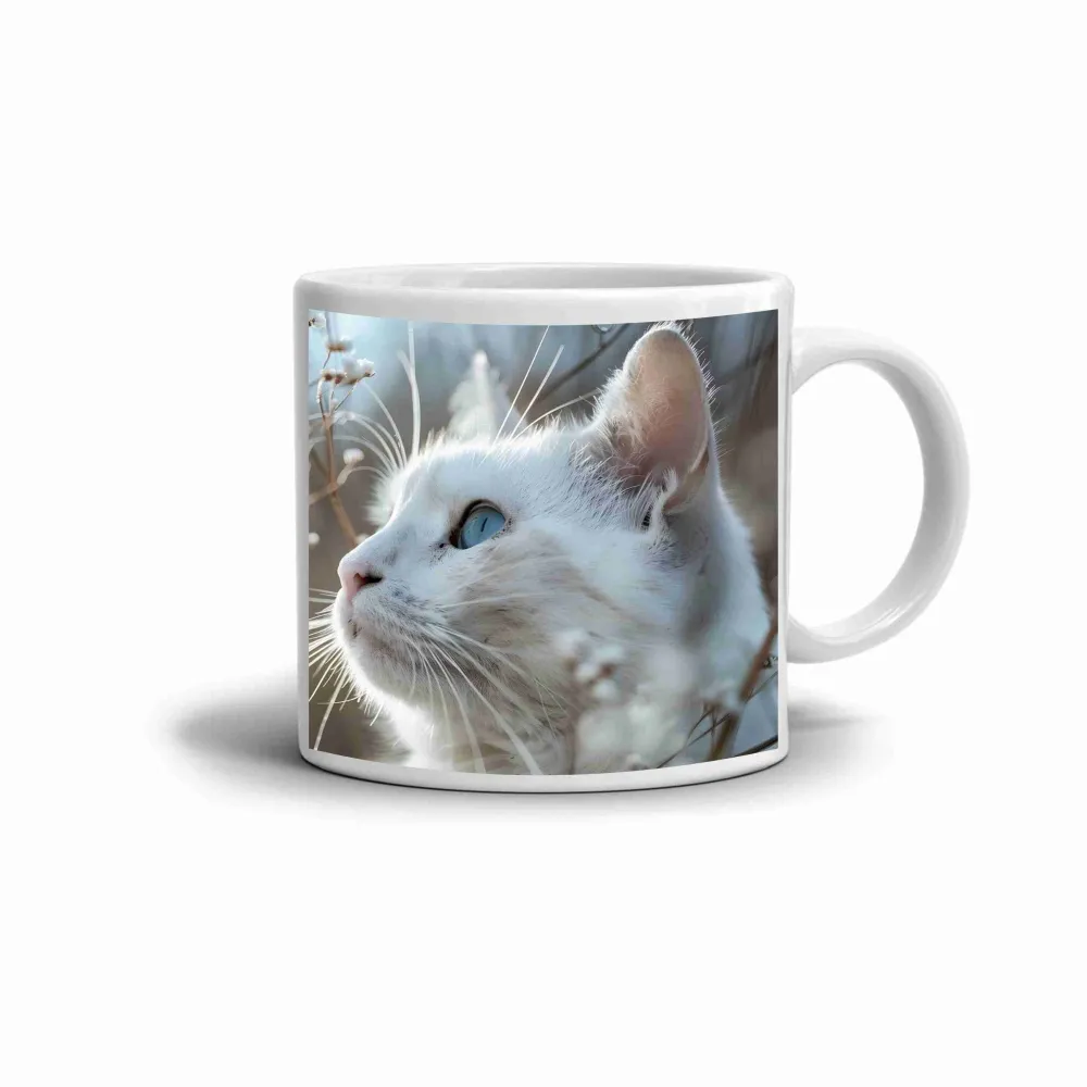 Na hrnku se objevuje jemný a klidný motiv bílé kočky, která pozorně hledí do dálky mezi drobnými větvičkami a měkkým světlem prosvětleným pozadím. Celek působí něžně, s důrazem na detail srsti, výrazné modré oko a tichou atmosféru, díky čemuž motiv krásně vynikne. Hrnek je vhodný do myčky!