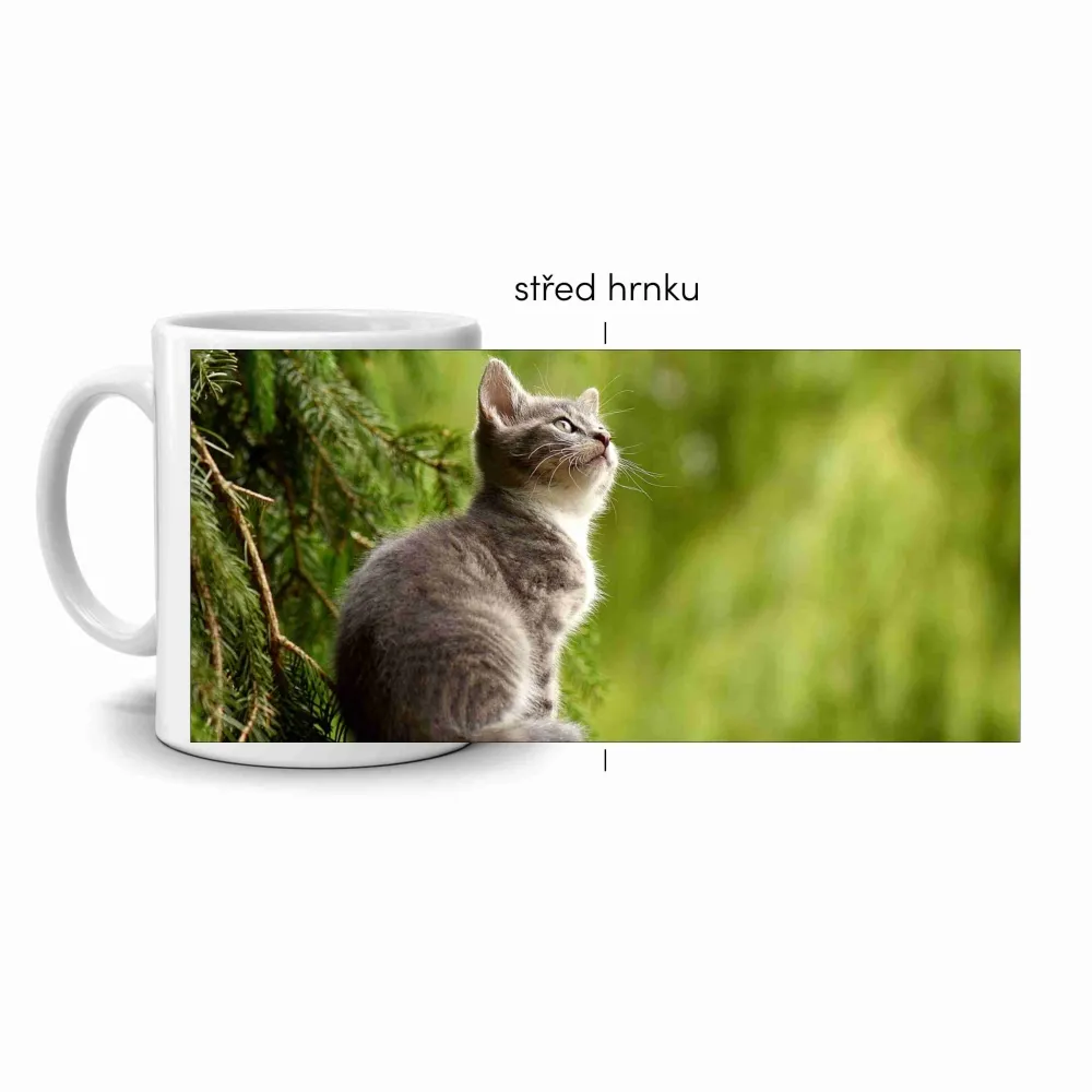 Motiv s koťátkem mezi větvemi stromu působí jemně a hravě. Zachycuje okamžik tichého pozorování, kdy se malý objevitel dívá vzhůru s dětskou zvědavostí. Přírodní prostředí a měkké světlo vytvářejí uklidňující atmosféru, která potěší každého milovníka koček a klidných chvil. Hrnek je vhodný do myčky!