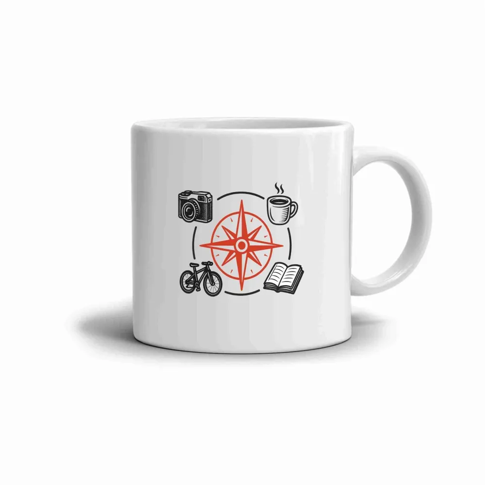 Motiv hrnku propojuje dobrodružství, odpočinek a radost z objevování. Uprostřed září kompas, symbol svobody a směru, kolem nějž jsou zobrazeny káva, fotoaparát, kolo a kniha, které dohromady tvoří ideální kombinaci pro všechny milovníky cestování i klidných chvil. Tento hrnek přináší inspiraci k objevování světa i sebe samých. Hrnek je vhodný do myčky!