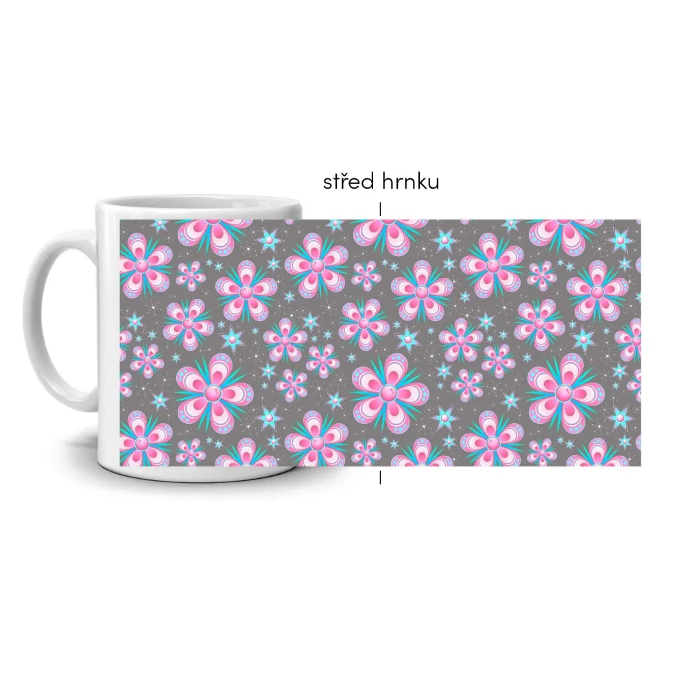 Tento keramický hrnek zaujme veselým motivem růžovo‑modrých květin na šedém pozadí, doplněným drobnými hvězdičkami, které mu dodávají hravý a lehce magický vzhled. Nad a pod hlavním motivem se nachází černá krajka, která působí elegantně a dekorativně a zvýrazňuje jemnost květin. Hrnek kombinuje praktičnost s atraktivním designem, který oživí každou kuchyni nebo pracovní stůl. Hrnek je vhodný do myčky!