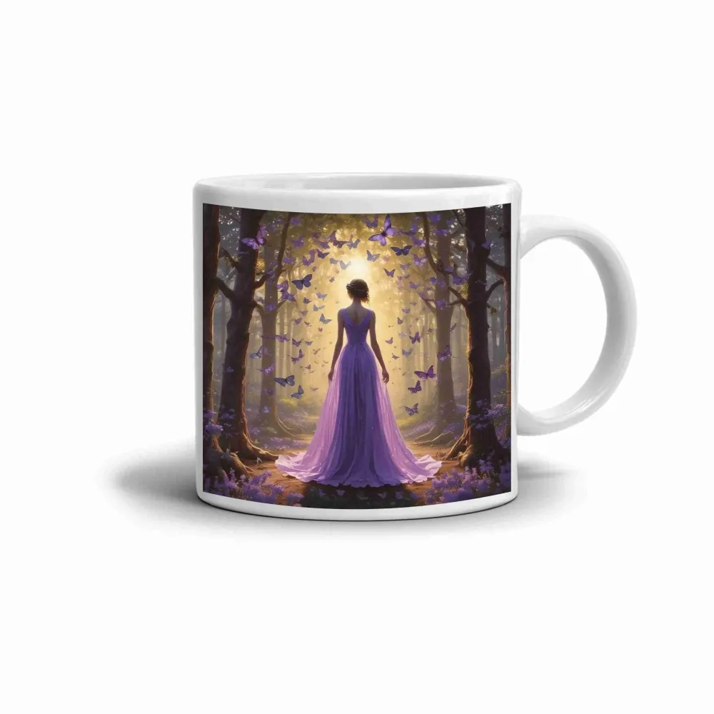 V jemném světle lesa stojí žena v dlouhých fialových šatech obklopená třepotajícími se motýly. Motiv hrnku působí snově a tajemně, vyvolává pocit klidu, krásy a naděje. Kombinace světla, barev a ladných linií přináší do každého dne kouzlo pohádkového okamžiku. Hrnek je vhodný do myčky!
