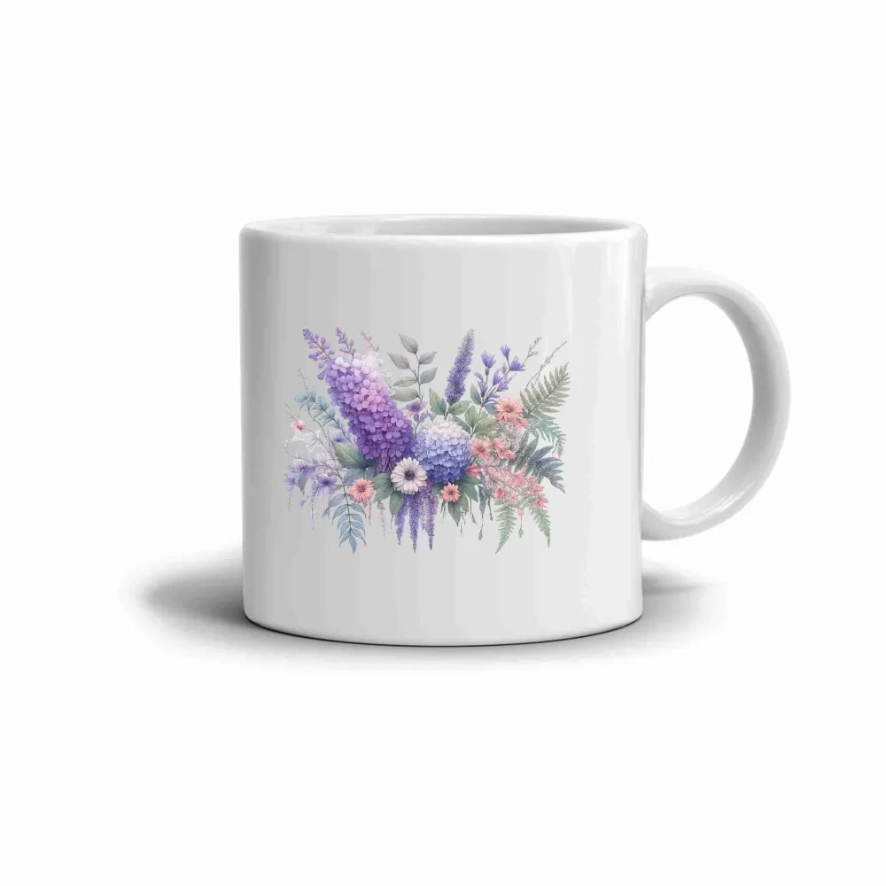 Něžná kytice v odstínech levandulové, růžové a modré vytváří klidný a harmonický motiv, který působí elegantně a svěže. Jemné květy a decentní listy se krásně doplňují a dodávají hrnku romantický charakter. Tento design potěší všechny, kdo mají rádi přírodní krásu, jemnost a vkusný styl. Hrnek je vhodný do myčky!