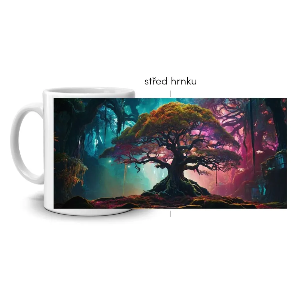 Motiv s majestátním stromem uprostřed kouzelného lesa působí jako pohled do snového světa plného fantazie a světla. Zářivé barvy listů a jemné odlesky vytvářejí dojem klidu, síly a harmonie s přírodou. Tento hrnek je jako malý kousek přírodního zázraku, který zpříjemní každý den. Hrnek je vhodný do myčky!