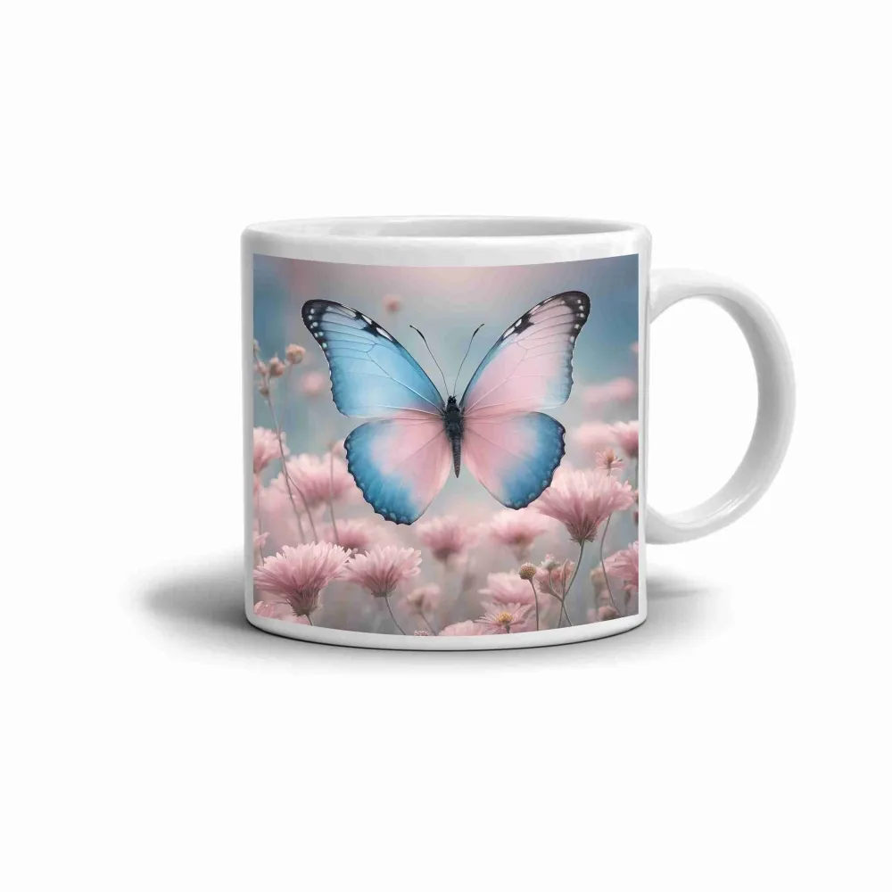 Nad jemným polem růžových květů se vznáší modro-růžový motýl, který působí jako ztělesnění lehkosti a krásy. Motiv hrnku přináší pocit klidu a harmonie, spojený s jemnou elegancí přírody. Kombinace pastelových odstínů vytváří uklidňující a poetický dojem, který potěší při každém pohledu. Hrnek je vhodný do myčky!