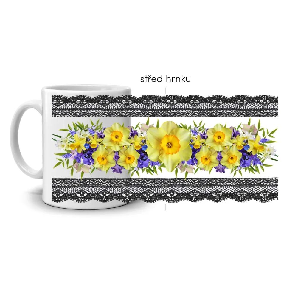 Motiv s žlutými narcisy a fialovými květy působí vesele a svěže. Kombinace zářivých barev v kontrastu s jemnou černou krajkou vytváří elegantní a přitom hravý celek. Tento hrnek přináší jarní energii a dotek romantiky do každého dne. Hrnek je vhodný do myčky!