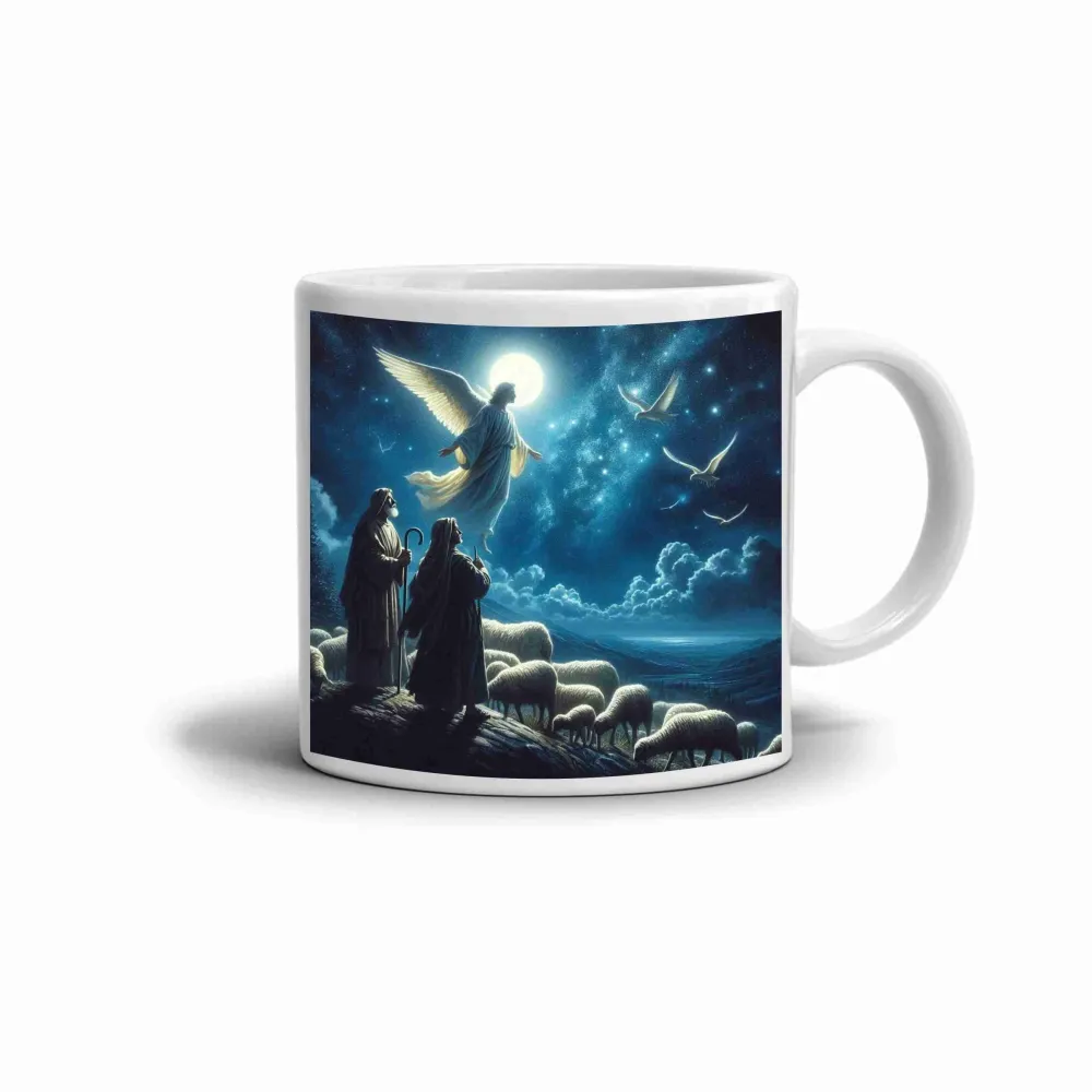 Noční obloha plná hvězd a jemné světlo měsíce vytvářejí kouzelnou atmosféru, kterou doplňuje postava anděla mezi pastýři a ovcemi. Motiv působí klidně a harmonicky, vyzařuje duchovní hloubku a připomíná krásu tichých zimních nocí. Syté barvy modré a bílé dodávají scéně jemný lesk a pocit naděje. Každý pohled na hrnek přináší vnitřní ztišení a pohodu. Hrnek je vhodný do myčky!