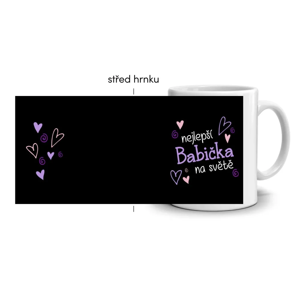 Kombinace černého podkladu a fialovo-růžových srdíček vytváří elegantní, ale zároveň hravou atmosféru. Motiv vyjadřuje lásku, péči a vděčnost, které si zaslouží každá babička. Jemné linie působí útulně a vyzdvihují kouzlo rodinného tepla, které tento hrnek dokonale symbolizuje. Hrnek je vhodný do myčky!