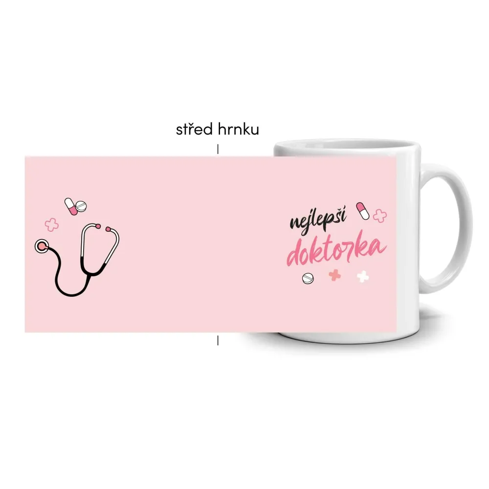 Světle růžové pozadí doplněné jemnými zdravotnickými prvky vytváří příjemný a moderní vzhled. Motiv působí čistě a vkusně, symbolizuje péči, profesionalitu a uznání. Celek vyzařuje pozitivní energii a lehkost, díky čemuž hrnek působí elegantně a přitom osobně. Hrnek je vhodný do myčky!