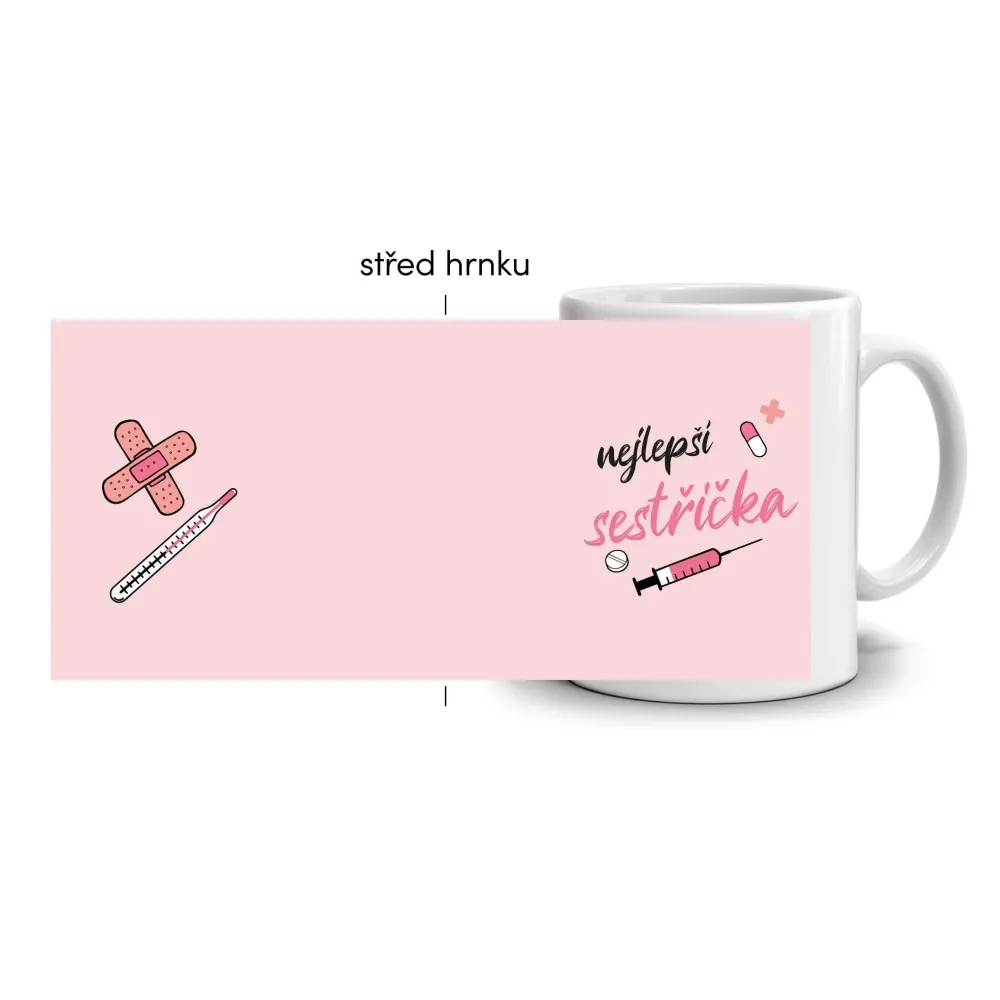 Jemné růžové pozadí spolu s drobnými zdravotnickými prvky vytváří milý a harmonický design. Motiv působí přátelsky a svěže, vyzdvihuje pečující povahu a obětavost zdravotních sester. Celkový vzhled je moderní, vkusný a působí dojmem uznání i respektu. Hrnek je vhodný do myčky!