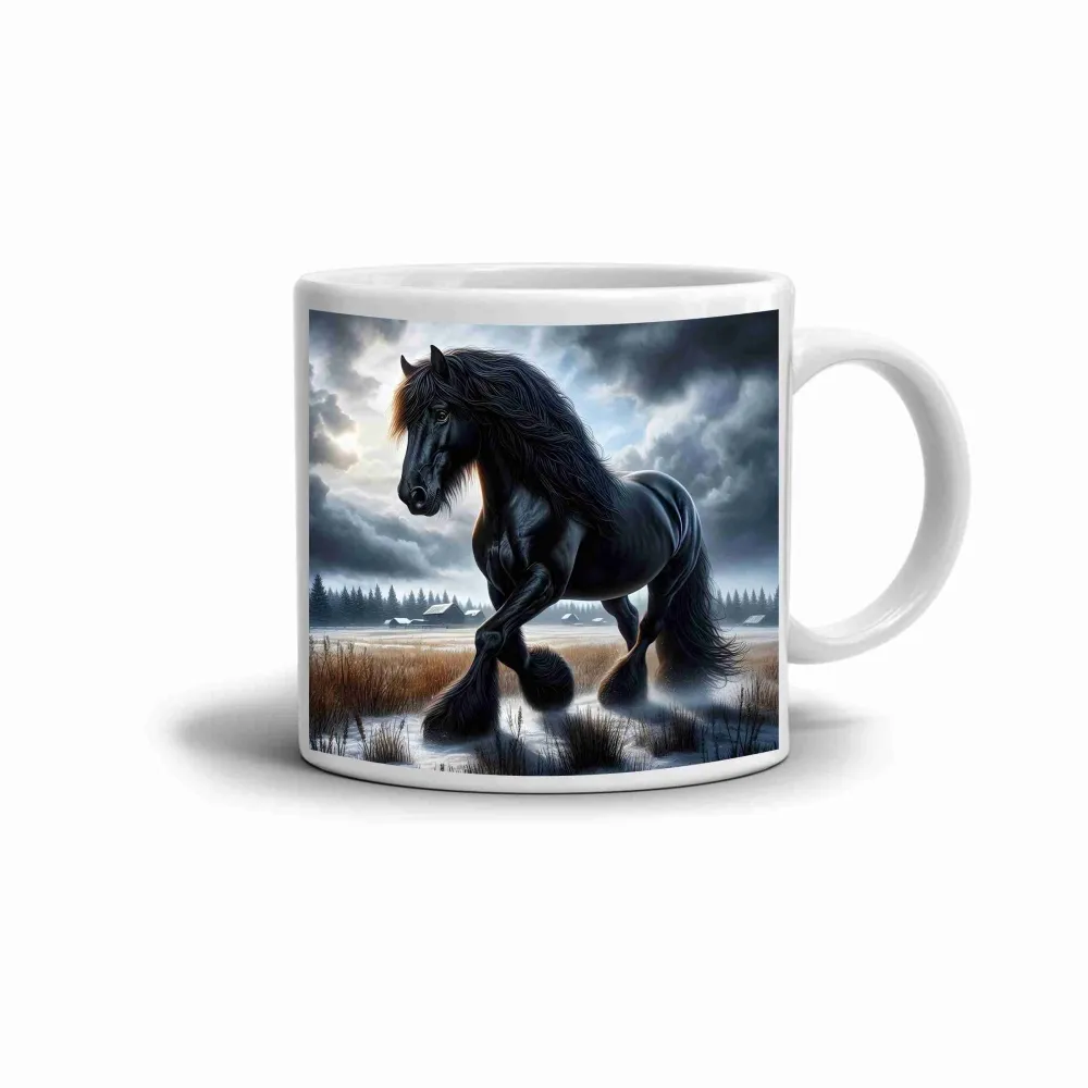 Na hrnku dominuje černý kůň v dramatické krajině, zachycený v pohybu a silné atmosféře. Motiv působí výrazně a sebevědomě, přesto zůstává vyvážený a přehledný. Spojení přírody, pohybu a klidné barevnosti vytváří obraz, který zaujme při každém pohledu a hodí se k běžnému každodennímu používání. Hrnek je vhodný do myčky!
