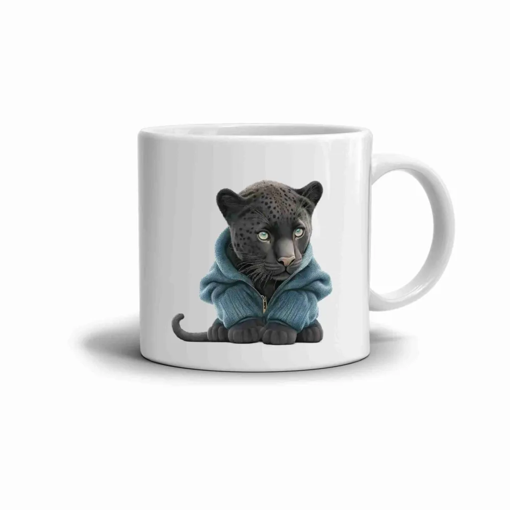 Motiv hrnku zachycuje půvabného pantera oblečeného do modré mikiny, který působí klidně a přitom sebejistě. Jeho zelené oči a tmavá srst vytvářejí výrazný kontrast s bílým pozadím a dodávají celku nádech tajemství. Kombinace elegance a jemnosti působí vyváženě a harmonicky, díky čemuž se hrnek stává originálním doplňkem pro chvíle odpočinku. Tento motiv osloví všechny, kteří mají rádi zvířata, styl a jedinečný design. Hrnek je vhodný do myčky!