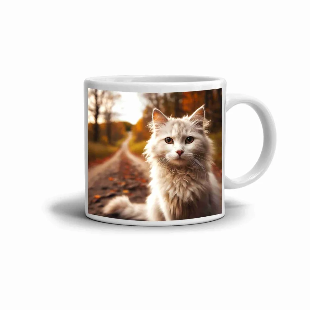 Na tomto hrnku je zachycena nádherná dlouhosrstá kočka, jejíž jemná sněhobílá srst krásně kontrastuje s teplými podzimními barvami v pozadí. Hluboký a klidný pohled kočky vytváří harmonický motiv, který působí hřejivě a přátelsky. Celková kompozice spojuje eleganci zvířete s atmosférou poklidné přírodní cesty. Hrnek je vhodný do myčky!