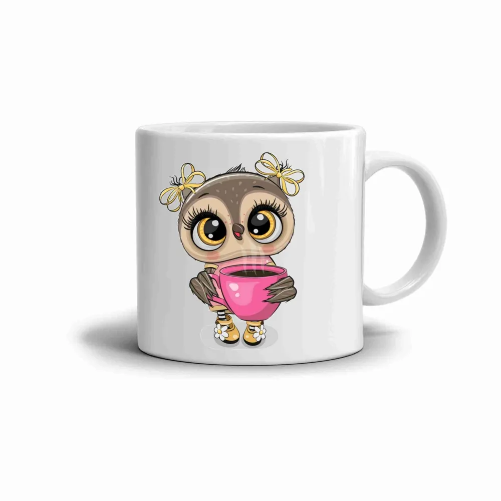 Motiv hrnku působí hravě a přátelsky. Roztomilá sovička s velkýma očima drží růžový hrnek plný teplého nápoje a působí dojmem pohody a ranního klidu. Žluté mašličky a drobné detaily dodávají celému motivu veselý a optimistický nádech, který rozzáří každý den. Hrnek je vhodný do myčky!