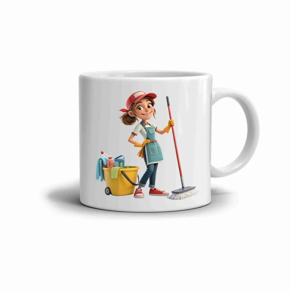 Usměvavá postavička s mopem a vědrem přináší do všedních dnů svěžest a optimismus. Motiv působí vesele a energicky, vyzařuje chuť do práce i radost z dobře odvedeného úklidu. Syté barvy červené, modré a žluté dodávají hrnku živý a příjemný vzhled. Tento design rozjasní každé ráno a přinese úsměv i během náročného dne. Hrnek je vhodný do myčky!