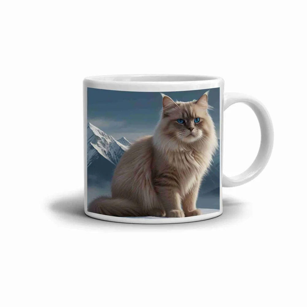 Na tomto hrnku je zachycena krásná dlouhosrstá kočka s výrazně modrýma očima, která působí klidně a zároveň hrdě v zasněžené horské scenérii. Jemné odstíny srsti ladí s chladnými tóny pozadí a vytvářejí působivý motiv, který přitahuje pozornost svou elegancí i jemností. Hrnek je vhodný do myčky!