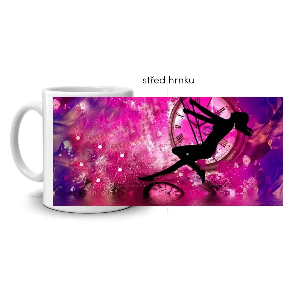 Záhadný a snový obraz propojuje ladnou siluetu ženy s motivem hodin, které symbolizují plynutí času. Fialovo-růžové pozadí vytváří pocit hloubky, fantazie a volnosti. Motiv hrnku působí jako poetické spojení času, pohybu a ženské elegance, které zaujme na první pohled. Hrnek je vhodný do myčky!