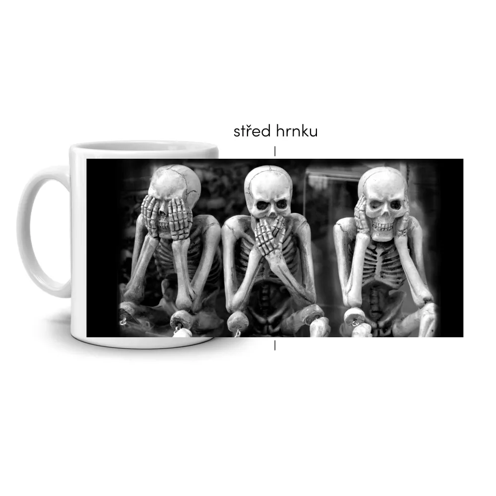 Trojice kostlivců na tomto hrnku vytváří výrazný abstraktní motiv, který spojuje humor i temnější nádech do jedné neobvyklé kompozice. Postavy sedí vedle sebe a jejich gesto zvednutých rukou působí jako hravé ztvárnění ticha a tajemství. Černobílý kontrast zvýrazňuje strukturu kostí i jemné detaily a dodává celému motivu silnou energii a originální vizuální charakter. Hrnek je vhodný do myčky!