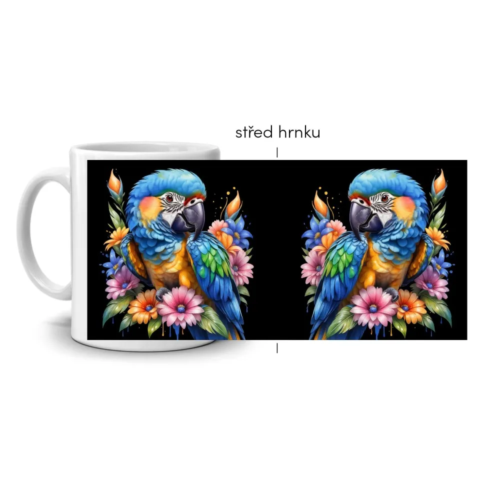 Zářivý motiv ary ararauny na černém pozadí vynikne s ještě větší intenzitou a hloubkou barev. Jasně modré, zelené a oranžové tóny nádherného papouška se krásně odrážejí od tmavého podkladu, díky čemuž celý motiv působí luxusně a výrazně. Květinové detaily v sytých odstínech dodávají hrnku hravou eleganci a tropický nádech. Tento hrnek přináší do každého dne dotek exotiky a optimismus ukrytý v zářivých barvách přírody. Hrnek je vhodný do myčky!