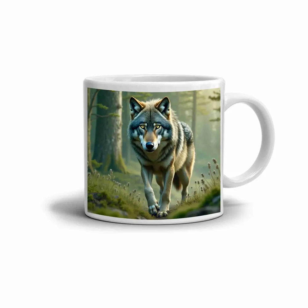 Lesní cestou kráčí majestátní vlk s pronikavým pohledem, který vyzařuje sílu a klid. Motiv hrnku působí tajemně a zároveň harmonicky, zachycuje divokou krásu přírody a svobodu. Jemné detaily srsti a tlumené barvy lesa vytvářejí působivou a vyváženou kompozici. Hrnek je vhodný do myčky!