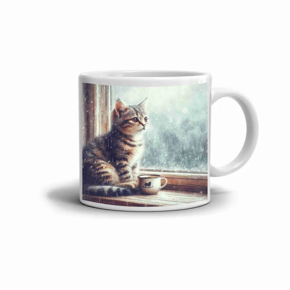 Malý roztomilý motiv s koťátkem u okna dodává tomuto hrnku hřejivou a klidnou atmosféru. Scéna působí jemně a poeticky, jako tichý zimní moment, kdy malé koťátko pozoruje padající sníh a užívá si příjemné teplo domova. Hrnek je vhodný do myčky!