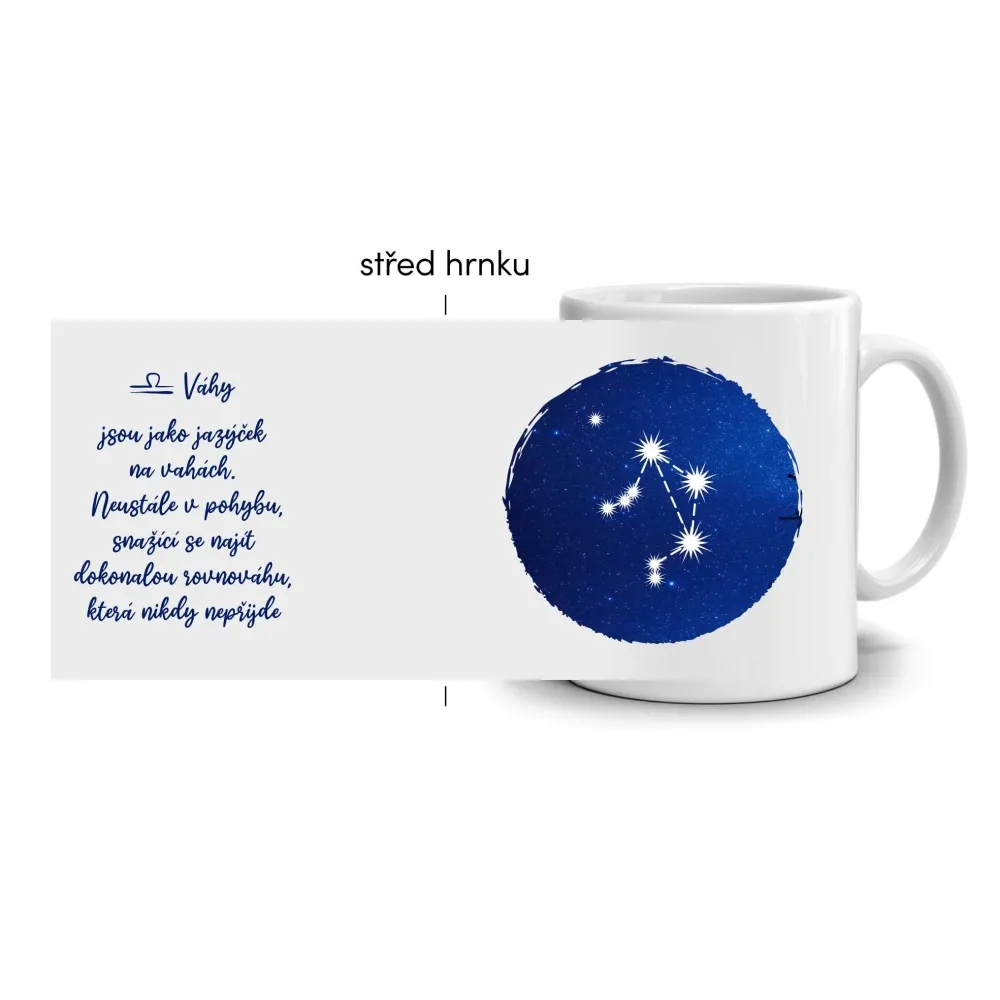 Motiv hrnku se znamením vah působí klidně a harmonicky. Váhy jsou jako jazýček na vahách, neustále v pohybu a přemýšlení, jak dosáhnout dokonalé rovnováhy, která nikdy nepřejde. Hvězdná konstelace na tmavě modrém pozadí symbolizuje vyváženost, krásu a schopnost vidět obě strany každé situace. Hrnek je vhodný do myčky!