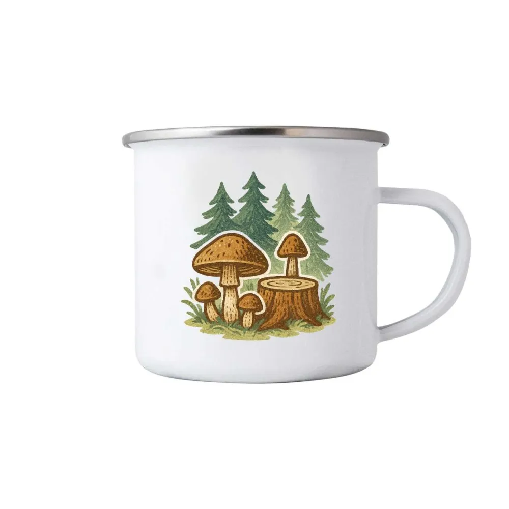 Motiv s houbami mezi stromy působí klidně a přírodně, jako by přenesl vůni lesa přímo na hrnek. Hnědé tóny hub ladí s jemnou zelení jehličnanů a dohromady vytvářejí harmonický obraz tichého koutku lesa. Tento design potěší každého, kdo má rád přírodu, lesní procházky a chvíle pohody u teplého nápoje. Hrnek je vhodný do myčky!