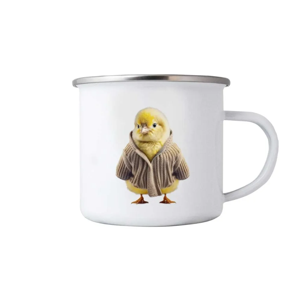Na hrnku se objevuje roztomilé kuřátko oblečené do jemného béžového svetříku a celé působí jako malý přítulný společník pro chvíle u kávy nebo čaje. Světlé barvy a hravý výraz dodávají motivu příjemně hřejivý tón který dokáže rozjasnit každý den. Hrnek je vhodný do myčky!