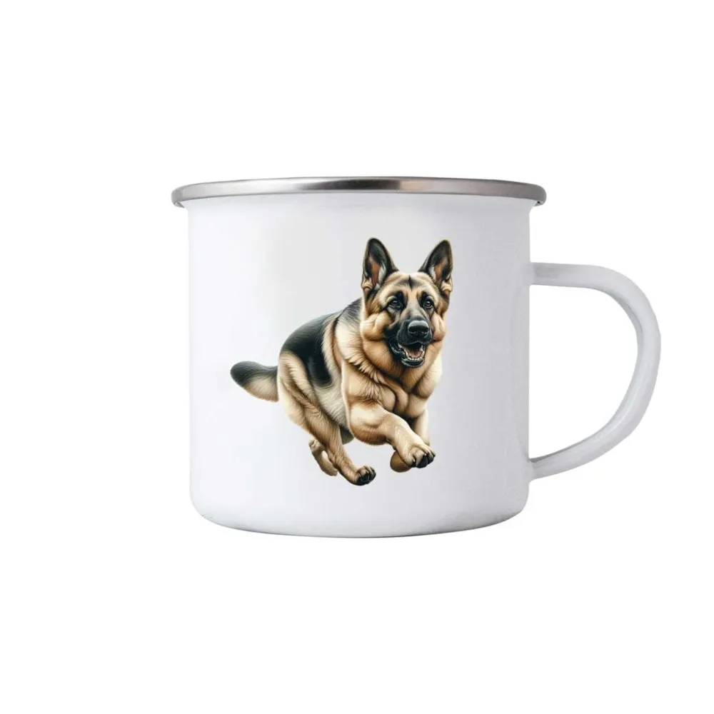 Na tomto plechovém hrnku vyniká krásný motiv německého ovčáka v pohybu, který působí energicky a věrně vystihuje povahu tohoto oblíbeného plemene. Ilustrace má příjemně dynamický styl a potěší každého milovníka psů. Hrnek je vhodný do myčky!