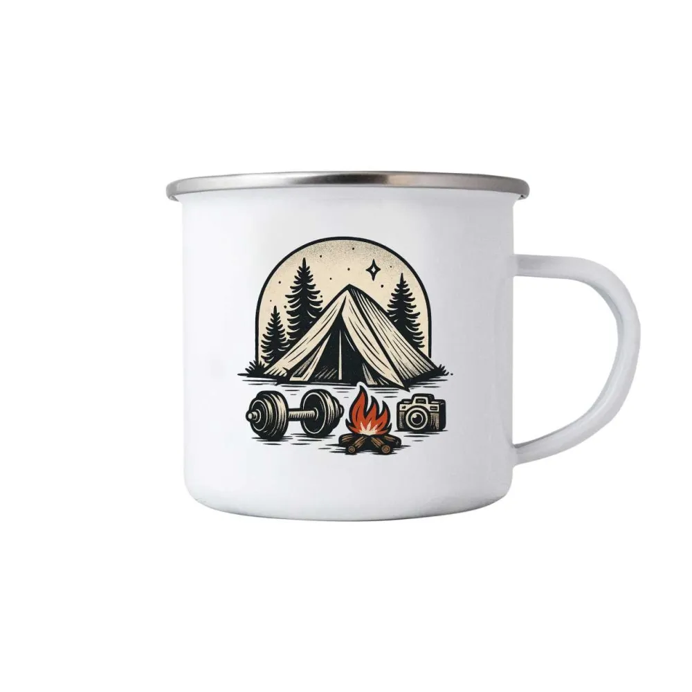Motiv s tábořištěm u lesa vyvolává pocit pohody a tepla z praskajícího ohně. Stan obklopený stromy a drobné detaily jako fotoaparát či činka připomínají chvíle strávené venku, kdy člověk najde rovnováhu mezi klidem a aktivitou. Tento design v sobě spojuje jednoduchost, přírodu a radost z obyčejných okamžiků pod širým nebem. Hrnek je vhodný do myčky!