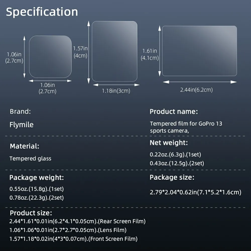 Značka: BRDRC Typ příslušenství: tvrzená ochranná skla na displej a objektiv Materiál: tvrzené sklo Rozměry zadního skla: 6,2 × 4,1 × 0,05 cm Rozměry skla na objektiv: 2,7 × 2,7 × 0,05 cm Rozměry předního skla: 4 × 3 × 0,07 cm Čistá hmotnost balení: 12,5 g (2 sady) Kompatibilita: GoPro Hero 13