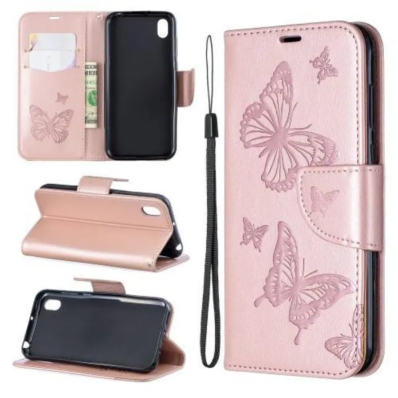 Butterflies PU kožené peněženkové pouzdro na mobil Huawei Y5 (2019) / Honor 8S - růžovozlaté