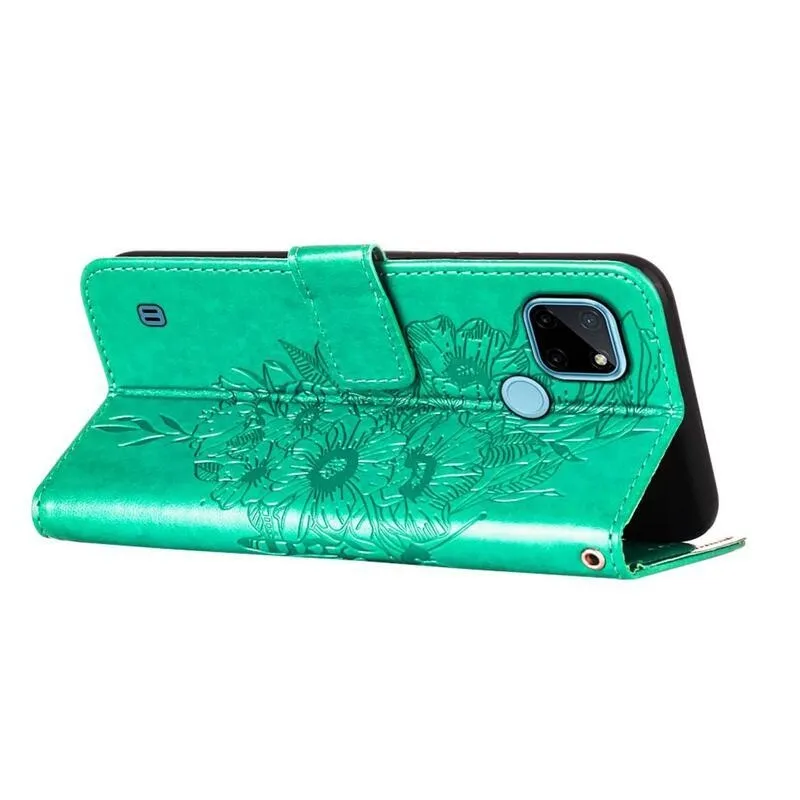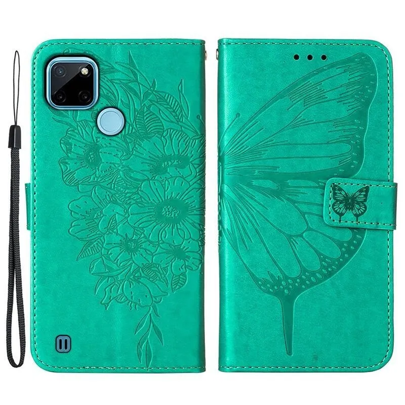 Butterflies PU kožené peněženkové pouzdro na mobil Realme C21Y/C25Y - zelené