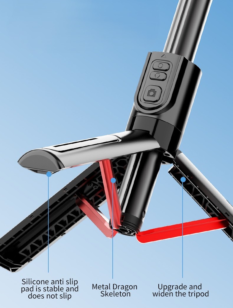 C08 stabilizátor na mobil se selfie tyčí, stativem a Bluetooth ovládáním - černá/červená